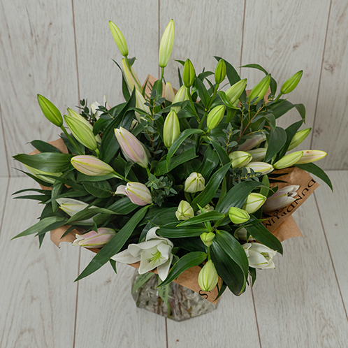 A hand tied bouquet of the finest oriental lilies. Beautifully arranged with seasonal foliage this heavily scented long lasting bouquet is sure to please. Please note that lilies are sent out in bud to guarantee a long vase life.